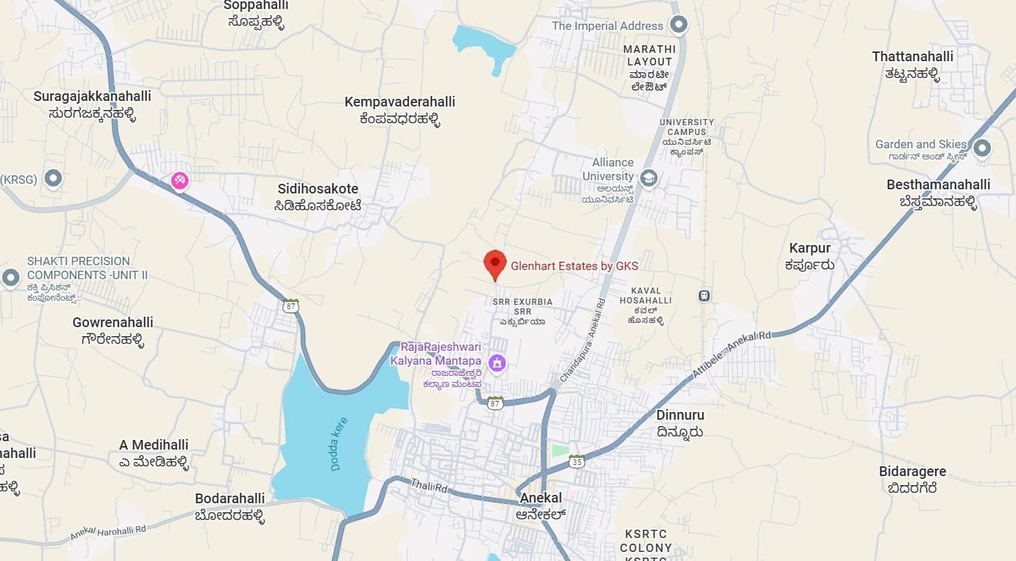 From GKS Glenhart Estates, residents can easily access major destinations across South Bangalore. Alliance University is just a few minutes away, and with Chandapura Circle and Hosur Road, you can quickly reach Electronic City and the Bommasandra Industrial Area. Narayana Hrudayalaya Hospital is about 20 minutes away, ensuring that advanced healthcare is close at hand. The NICE Road junction and the upcoming STRR provide convenient routes to all major city areas.